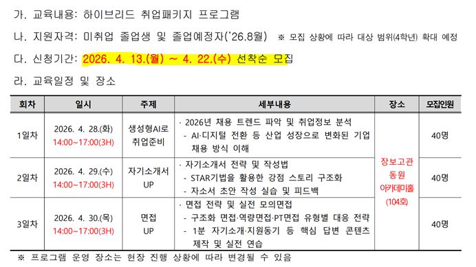 2026년 대학일자리플러스센터사업 '하이브리드 취업 패키지' 특강 참여자 모집 안내
