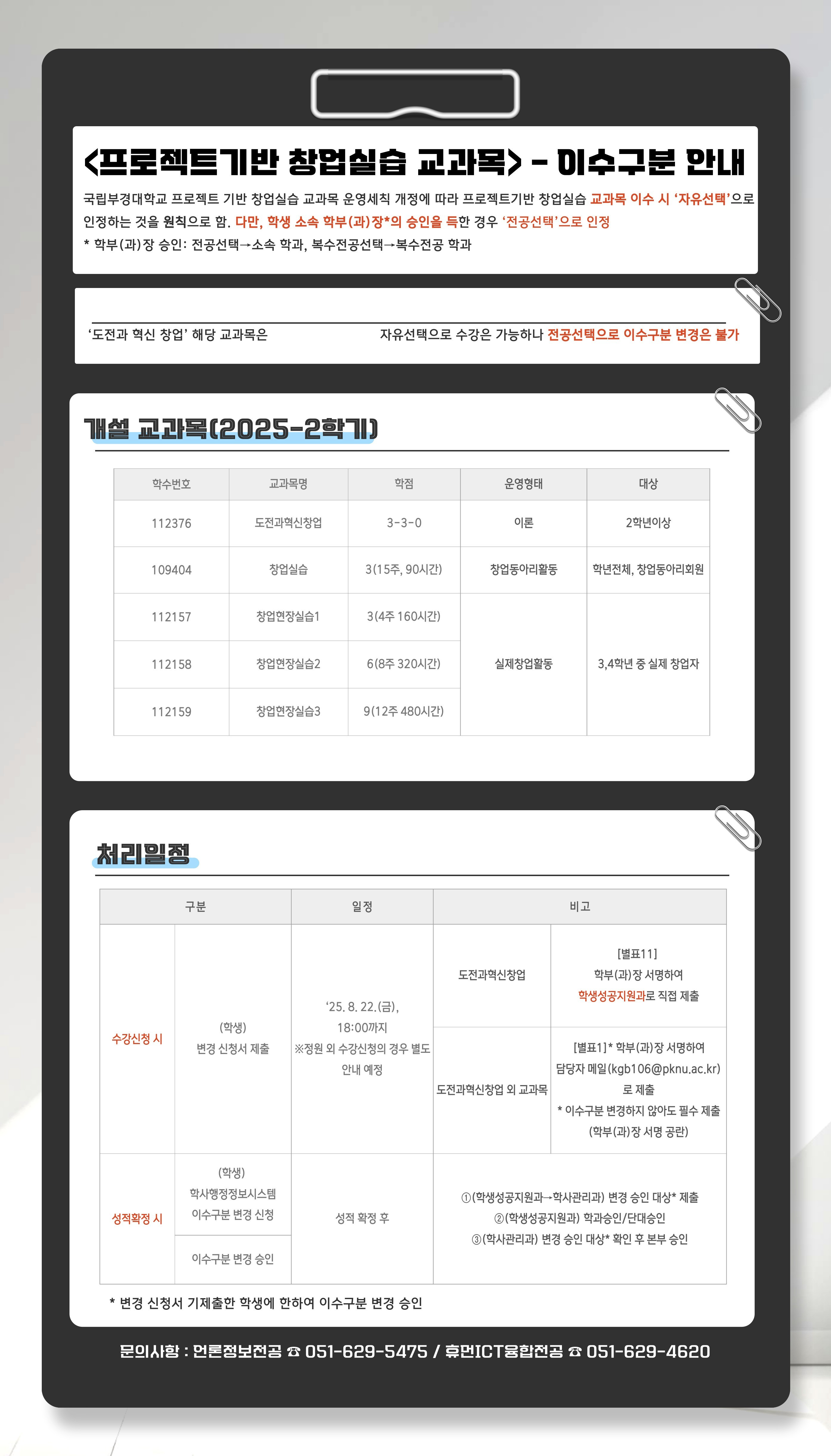 「프로젝트기반 창업실습 교과목」 이수구분 변경 안내 국립부경대학교 프로젝트 기반 창업실습 교과목 운영세칙 개정에 따라 프로젝트기반 창업실습 교과목 이수 시 ‘자유선택’으로 인정하는 것을 원칙으로 함을 안내드립니다. 다만, 학생 소속 학부(과)장*의 승인을 득한 경우 ‘전공선택’으로 인정할 수 있습니다. * 학부(과)장 승인: 전공선택→소속 학과, 복수전공선택→복수전공 학과 ※ 이수구분 방침 ※ ‘도전과 혁신 창업’ 해당 교과목은 자유선택으로 수강은 가능하나 전공선택으로 이수구분 변경은 불가함을 알려드립니다. 이점 참고하시어 본수강신청 및 졸업 이수구분 계획에 착오 없으시길 바랍니다. 감사합니다. 가. 개설 교과목(2025-2학기)