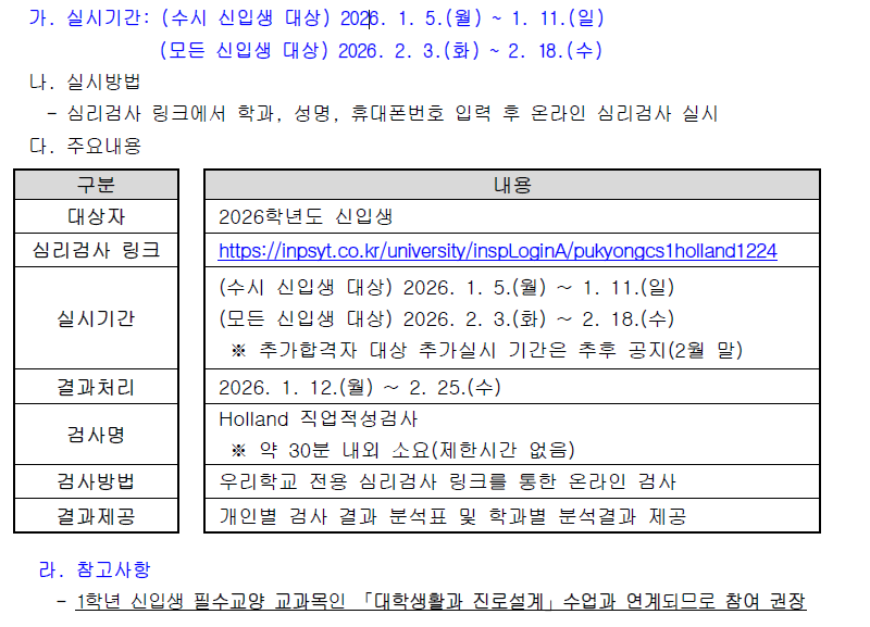 * 심리검사 링크: https://inpsyt.co.kr/university/inspLoginA/pukyongcs1holland1224 * 문의: 국립부경대 학생상담센터 (051-629-6765) |